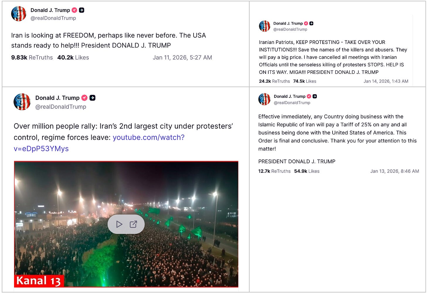 This helps explain the apparent gap between rhetoric and action. While Trump warned that severe repression of protesters would trigger consequences, he has so far relied on alternative instruments: tightening economic pressure, targeting third parties that sustain Iran economically, and publicly encouraging protesters while signaling that external pressure would continue. These measures preserve coercive leverage without crossing the threshold into open war.